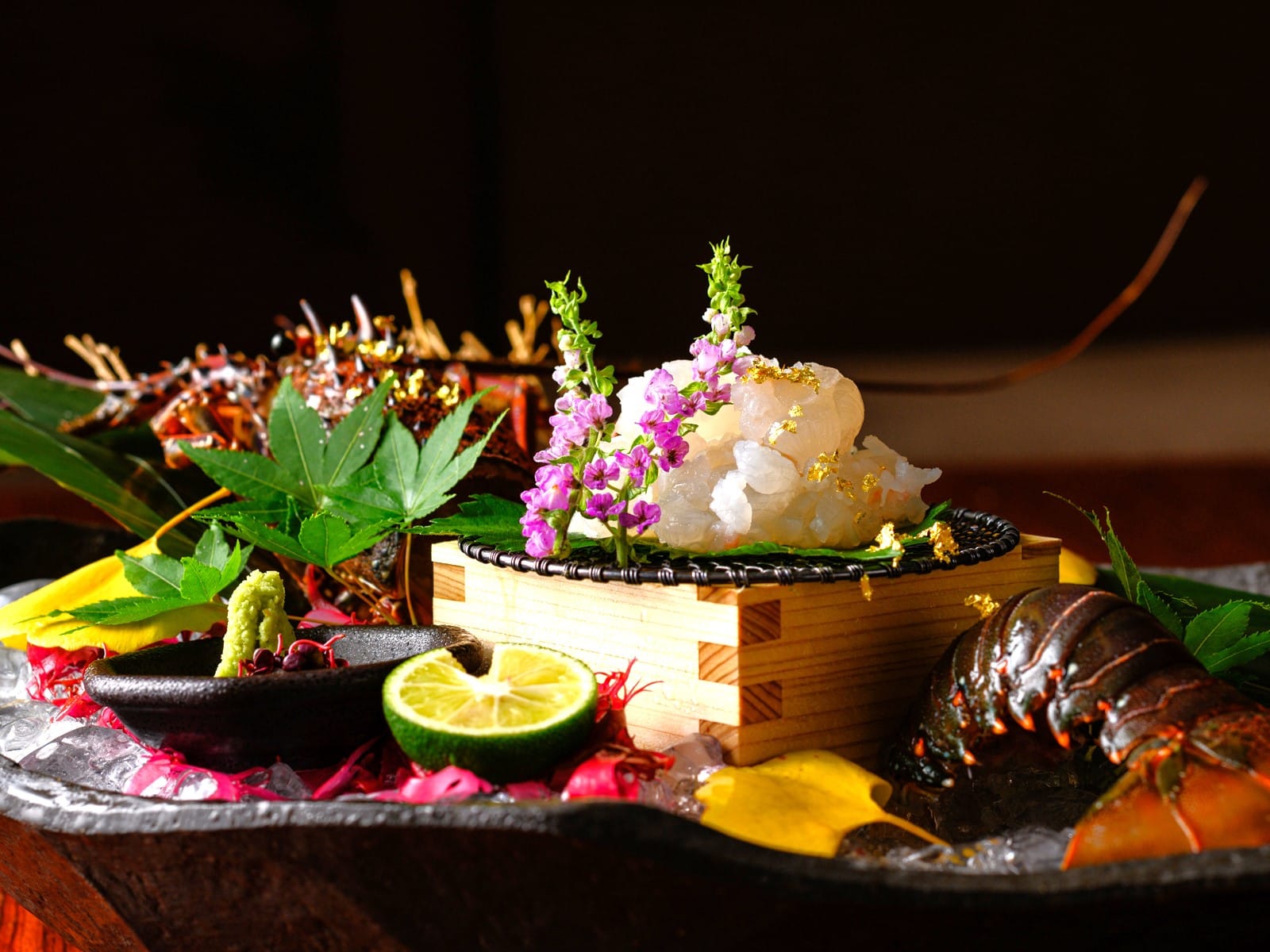 四季の恵みを映す先付けに始まり、生簀から取り上げたばかりの伊勢海老を含む厳選お造りや魚介料理、肉料理のダブルメインへと続く贅沢な献立。