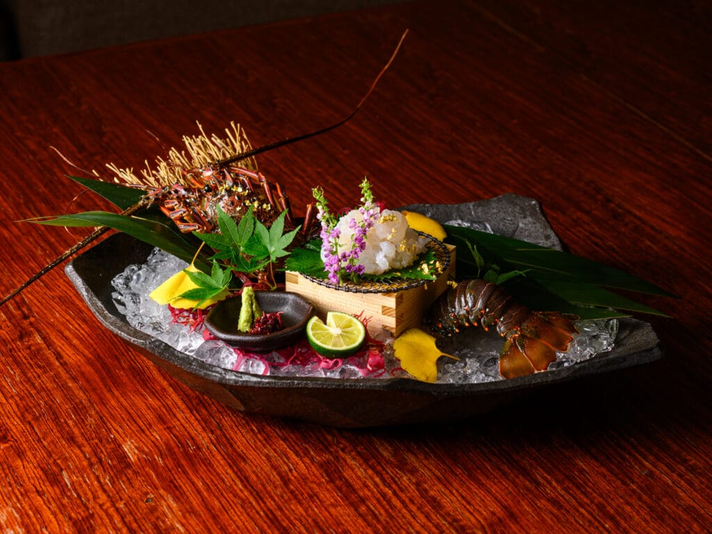 四季の恵みを映す先付けに始まり、生簀から取り上げたばかりの伊勢海老を含む厳選お造りや魚介料理、肉料理のダブルメインへと続く贅沢な献立。